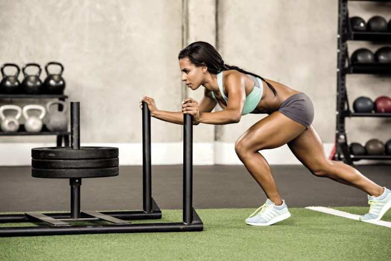 슬레드에 원하는 중량을 끼우자. 슬레드 뒤에 서서 양손에 손잡이를 하나씩 잡자. 최대한 빠르게 슬레드를 앞으로 밀자. 다리 전체로 힘을 내자. 무릎과 엉덩이를 펴는 동작에 집중하면서 슬레드를 밀자. 정해진 시간 동안 계속하자.