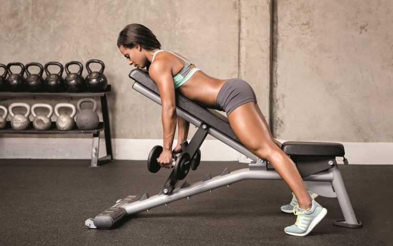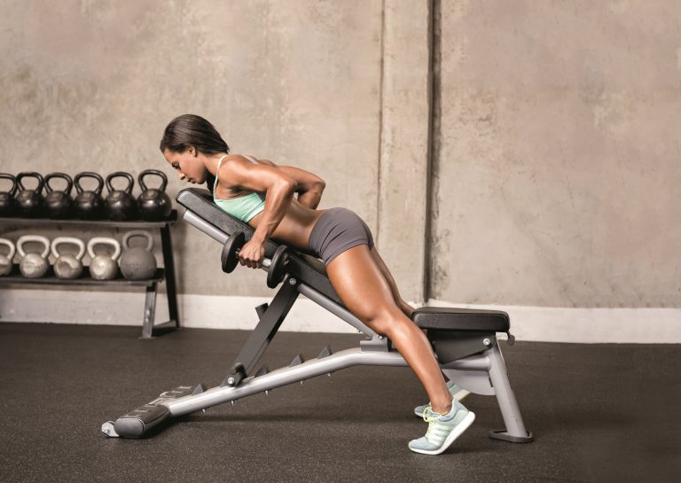 30도로 세팅한 인클라인 벤치에 엎드리자. 덤벨을 쥔 손은 어깨 바로 밑으로 뻗고, 손바닥은 서로 마주 보게 하자(A).