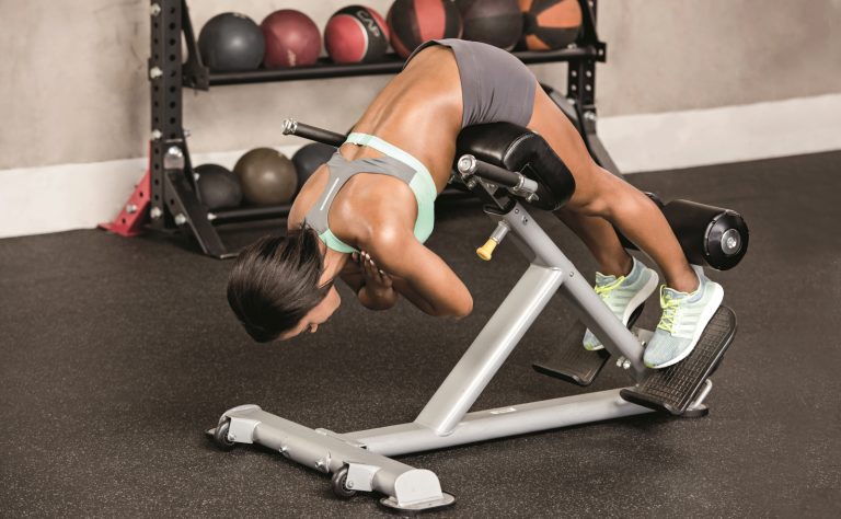 하이퍼익스텐션 벤치에 자리를 잡자. 양손은 가슴 앞에 교차하고, 발은 패드 밑에 고정하자(A). 난이도를 높이려면 원판을 들자.