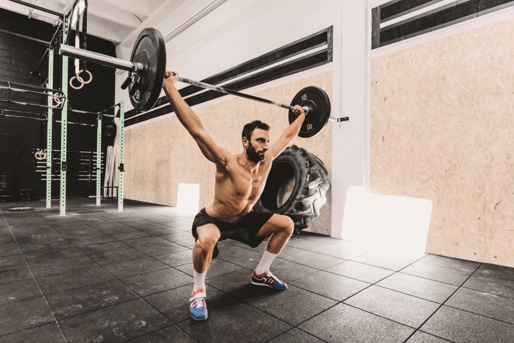 운동법: 양손을 어깨너비의 두 배 정도로 벌려서 봉을 잡고 머리 위로 밀자. 발끝은 밖으로 돌리자. 엉덩이를 뒤로 빼며 최대한 깊이 쭈그려 앉되 허리의 아치가 사라지지 않게 주의하자.