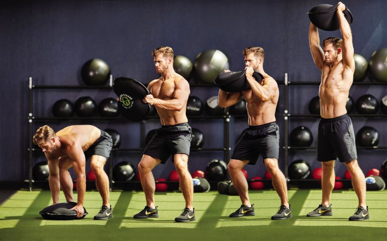 샌드백을 몸 앞의 바닥에 내려놓고 엉덩이를 아래로 낮추자. 이때 등은 평평하게, 가슴은 밖을 향하게 유지한다. 몸을 일으켜 세우며 샌드백을 어깨 가까이로 가져오자. 그런 다음 샌드백을 머리 위로 들어 올리자. 이때 무릎을 살짝 굽혔다 펴는 탄력을 활용해서 폭발적으로 들어 올린다.