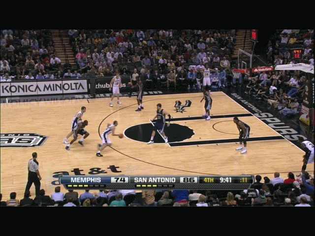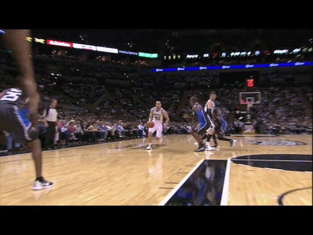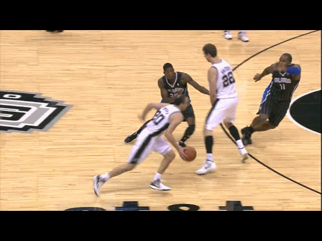 마누 지노빌리가 오른쪽으로 돌파를 시도하려고 하니까 수비가 그쪽으로 중심을 완전히 옮기죠