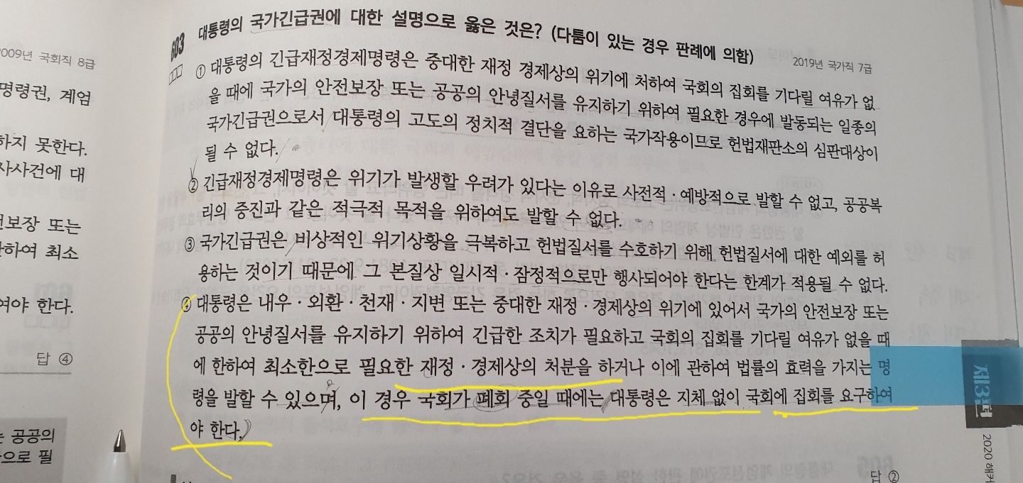 작성자심심해용 작성시간 20.03.15 지적을 잘 해주셔서 감사합니다. 사실 조문을 보면 국회소집요구를 해야 한다는 말은 없습니다. 객관식은 상대적으로 풀어야 하니 정답 2번은 확실하구요. 교재에 있는 건 학설상의 이야긴데 요즘 출제가 워낙 헌법조문 정확히 판례의 심화로 출제가 되고 있어서 이는 조문 그대로 하면 4번은 그런 말이 없으니 2번을 정답으로 해야 할거 같습니다. 이 경우 교재를 수정해야 할거 같습니다. 추후 선생님께 이야기 드려 오타 게시판에 교재 내용을 수정해서 조문 그대로 수정해서 다시 오타게시판에 올려 놓겠습니다. 감사합니다.