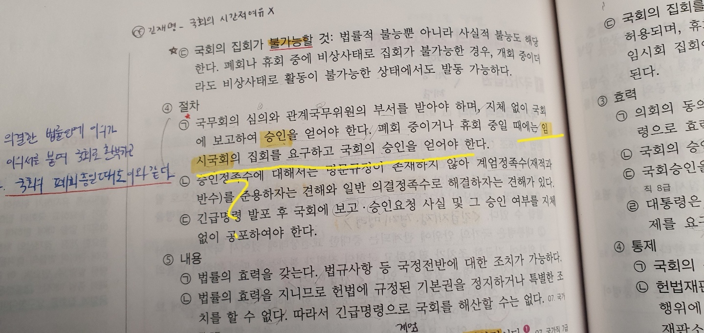 근데 기본서에 집회가 불가능한 긴급명령권일 때는 폐회중에 임시국회집회 요구하고 국회 승인을 얻어야 한다고 되어있네요