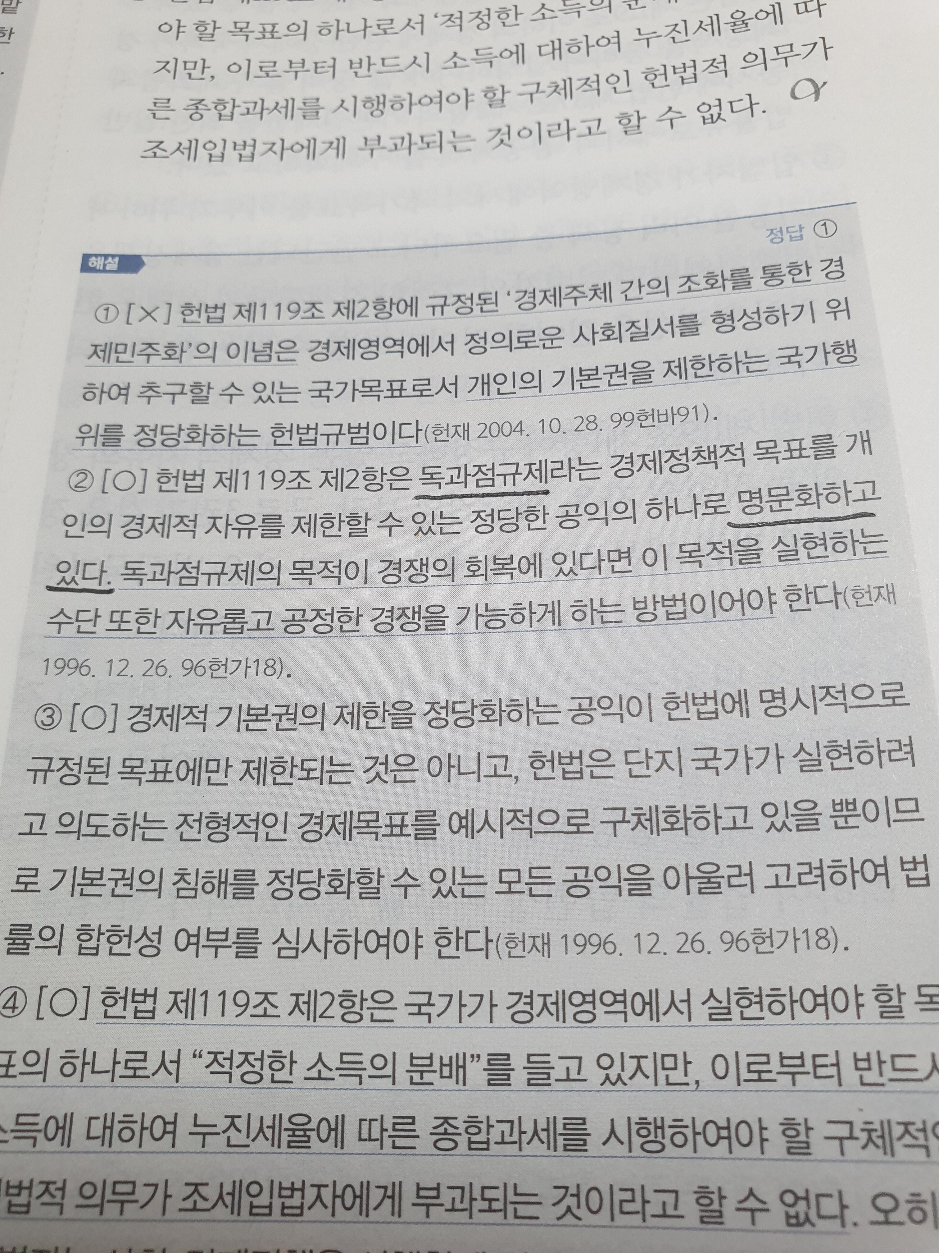 현행 헌법상 경제적 기본질서 질문입니다 작성자송이|작성시간22.07.26|조회수104 목록 댓글 1 글자크기 작게가 글자크기 크게가 독과점 명시 규정이 없다고 배웠는데 문제집 해설에명문화하고 있다고 하네요 뭐가 맞나요? 다음검색 현재 게시글 추가 기능 열기 북마크 공유하기 신고 센터로 신고 댓글 댓글 1 댓글쓰기 답글쓰기 댓글 리스트 작성자민중사랑 | 작성시간 22.07.27 조금 애매한 부분입니다. 독과점이 명시되어 있는건 아니지만 독과점 규제라는 목표는 명문화 되어 있다고 이야기 하니까요. 상대적으로 풀어야 하지만 최근 기출 지문대로 보시는 것이 좀더 안전할거 같습니다. 댓글 전체보기