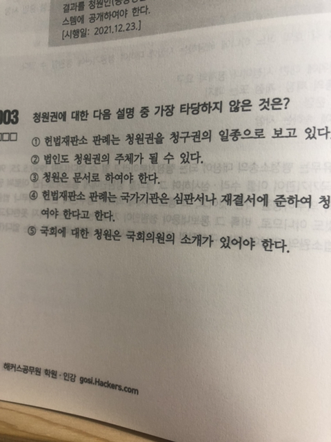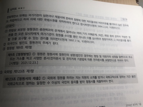 3번에 5번선지 해설에보면 의원의 소개를 받거나 국민의 동의를 받아 청원서를 제출한다 라고 되어있는데 이렇게 되면 방법이 두가지라서 5번선지의 있어야한다 라는 표현은 알맞지 않은거 아닌가 하고 의문이듭니다! 4번 선지가 확실하게 틀린건 알겠는데.. 5번 선지처럼 표현해도 맞는 표현인가요??