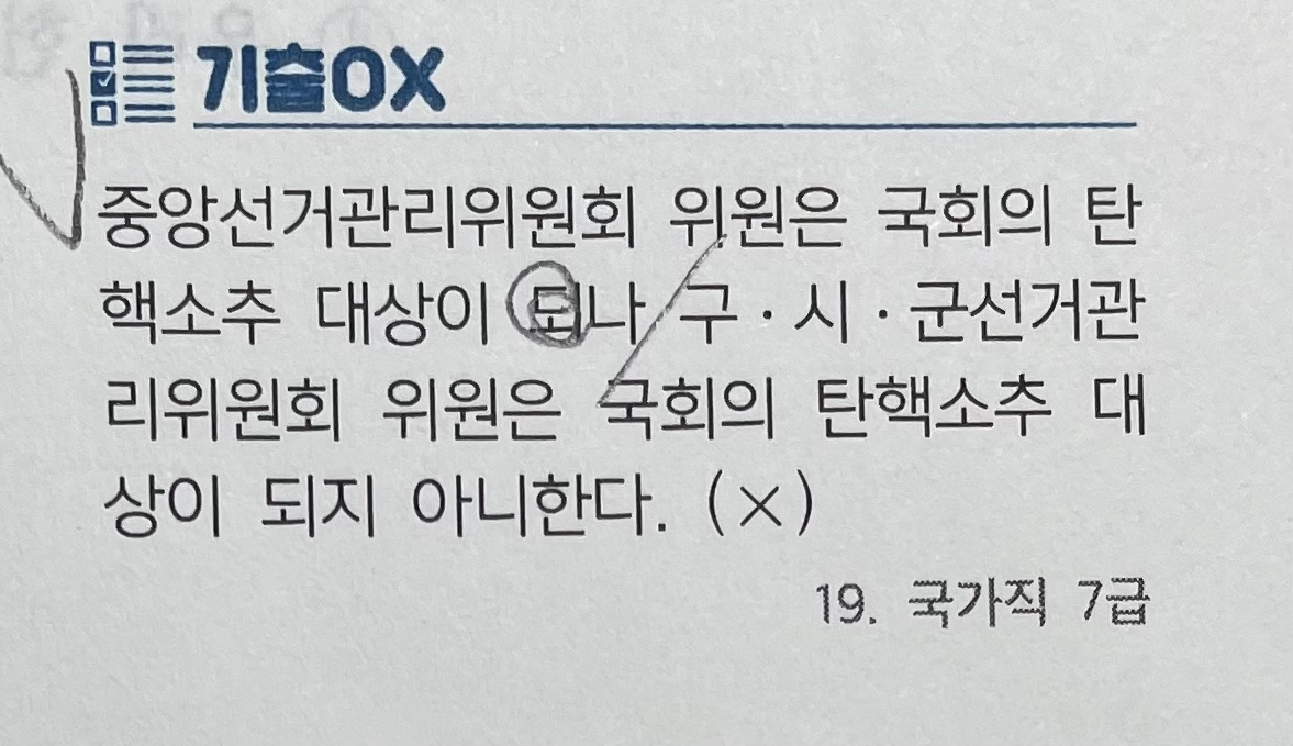 해당 문제 정답이 O인것 같은데 어느 부분에서 틀린건지 모르겠어서 문의드려요!! 구,시,군 선거관리 위원회 위원은 국회의 탄핵소추 대상에 안나와있던데 소추대상이 되나요..?