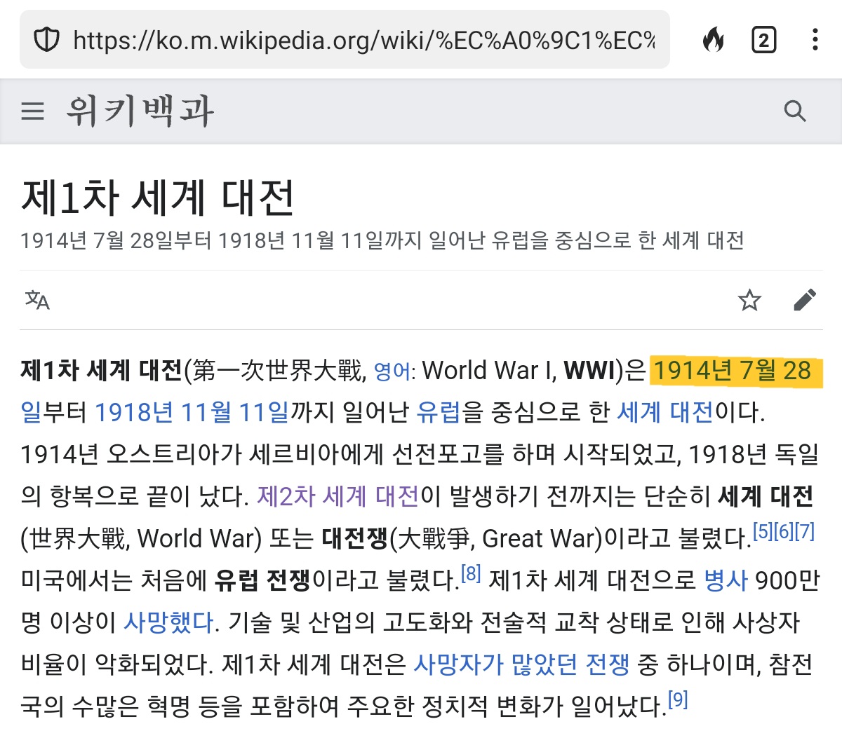 μλ₯Όλ€μ΄ μ 1μ°¨ μΈκ³λμ μμμΌ 19140728 μ«μλ₯Ό κ²μμ°½μ μ λ ₯ν΄ λ³΄μΈμ.