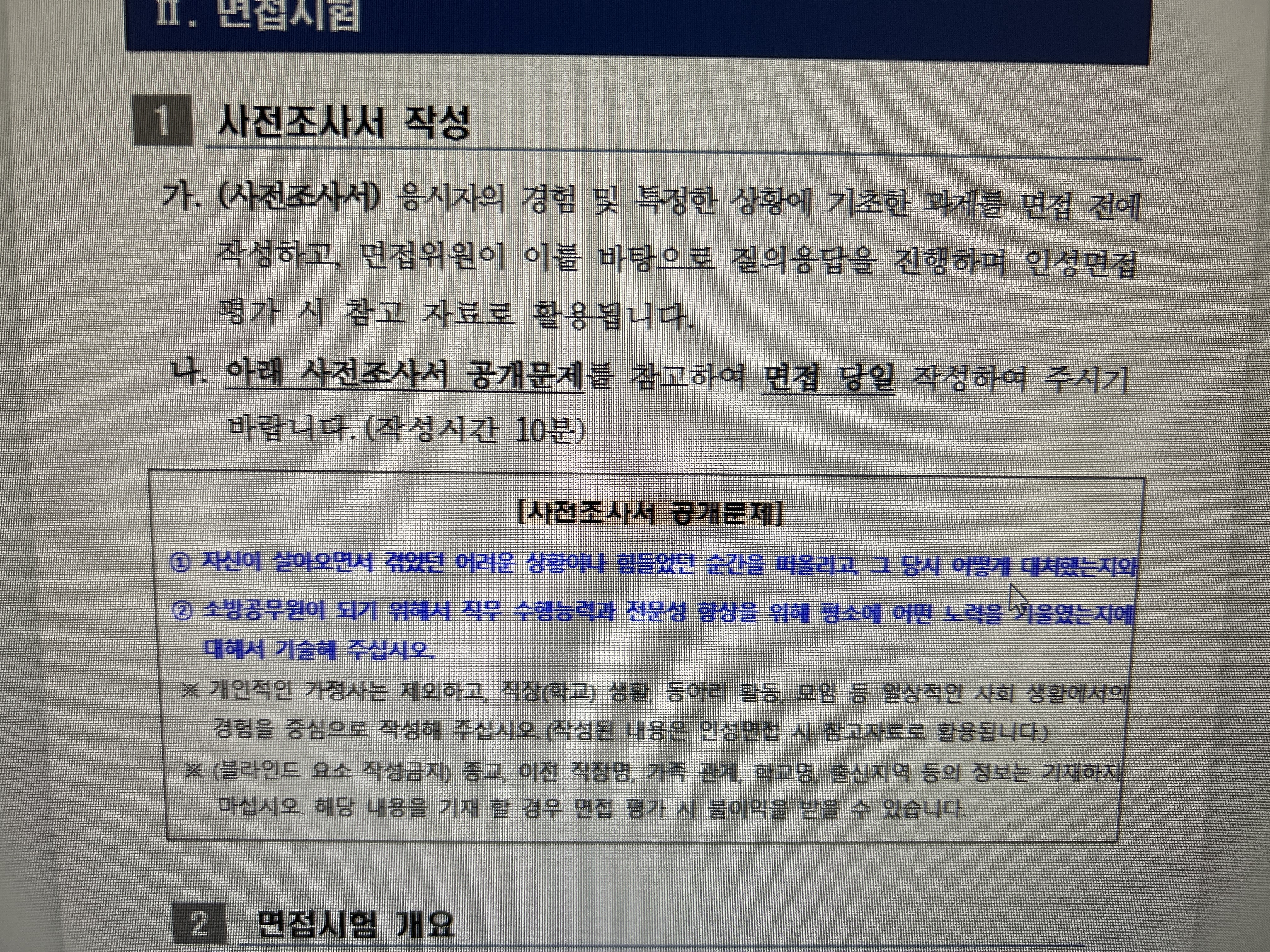 소방면접 사전조사서가 공개문제로 변경되었습니다 작성자소방소방1|작성시간25.05.22|조회수67 목록 댓글 1 글자크기 작게가 글자크기 크게가 오늘 14시 소방청 공지에 사전조사서가 공개문제로 바뀌어서 면접당일날 작성한다고 합니다 혹시 수강생들에게 첨삭 도움주시는지 궁금하여 여쭤드립니다. 다음검색 현재 게시글 추가 기능 열기 북마크 공유하기 신고 센터로 신고 댓글 댓글 1 댓글쓰기 답글쓰기 댓글 리스트 작성자노관호 공무원 | 작성시간 25.05.22 네네 일정 올릴께요 ㅋㅋ 댓글 전체보기