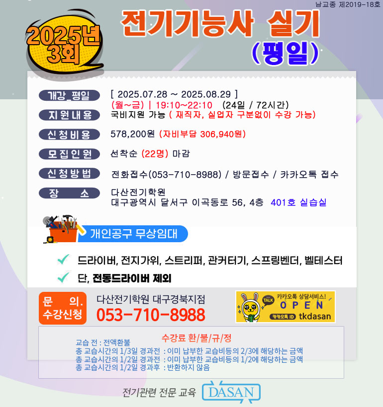 [국비지원_마감] 전기기능사실기(평일)_25.07.28-25.08.29 작성자다산 장원식원장|작성시간25.05.14|조회수49 목록 댓글 0 글자크기 작게가 글자크기 크게가 다음검색 현재 게시글 추가 기능 열기 북마크 공유하기 신고 센터로 신고 댓글 댓글 0 댓글쓰기 답글쓰기 댓글 리스트