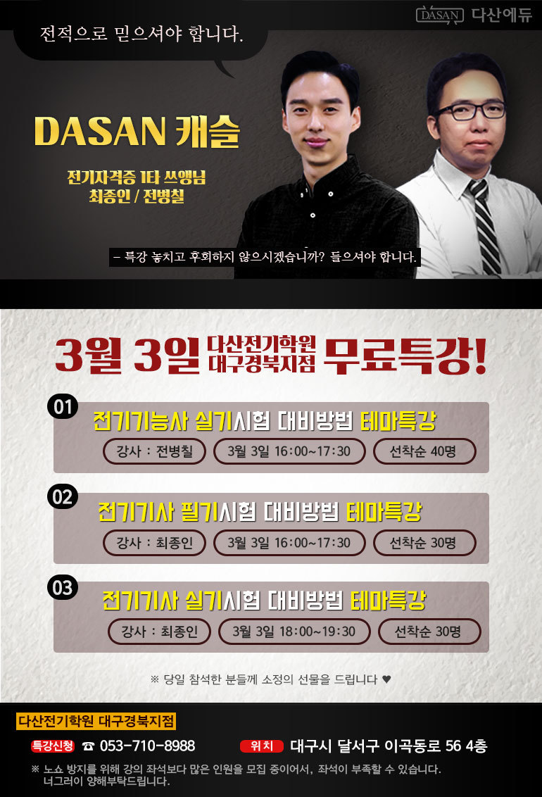 [마감] 최종인, 전병칠 전기기능사, 전기기사 선착순 무료특강! 작성자다산에듀|작성시간19.02.18|조회수1,342 목록 댓글 8 글자크기 작게가 글자크기 크게가 다음검색 현재 게시글 추가 기능 열기 북마크 공유하기 신고 센터로 신고 댓글 댓글 8 댓글쓰기 답글쓰기 댓글 리스트 작성자강명훈 | 작성시간 19.02.22 일산에서 특강 해주시나여? 작성자있는 그대로 | 작성시간 19.02.23 대전도 부탁드립니다. 작성자예원아범 | 작성시간 19.02.24 시골사는 촌놈은 이래저래 참 힘든게 한두가지가 아니내요...ㅎㅎ 작성자전기초보생 | 작성시간 19.02.27 인천 한표 추가요 작성자국수 | 작성시간 19.03.03 이런 오늘 그냥 동영상 보고 있었는데 진작 봤으면 갔을것을........ㅠ.ㅠ 댓글 전체보기