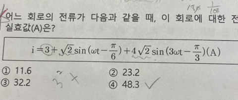 출제된 기출문제랑 비교했을때 보기문항은 같은데, 주어진 비사인파의 전류가 다릅니다. 푼다해도 보기문항의 답은 없어보입니다. -