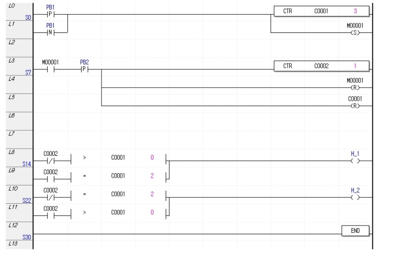 m0001이 set 되지만 pb2를 누르면 m0001이 리셋되어버려 죽어서 두번째 동작을 하지 못하는데