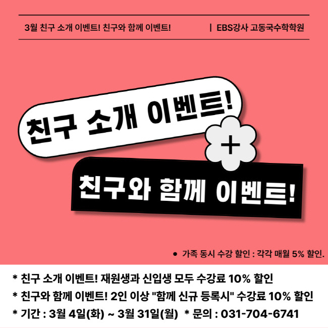 EBS강사 고동국 수학학원 3월 신학기 친구 소개, 친구와 함께 이벤트 신입생, 재원생, 2인 이상 신규 등록생 수강료 10% 할인