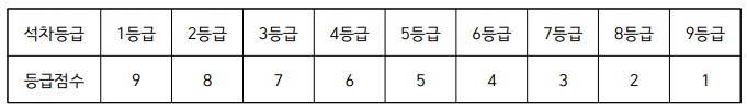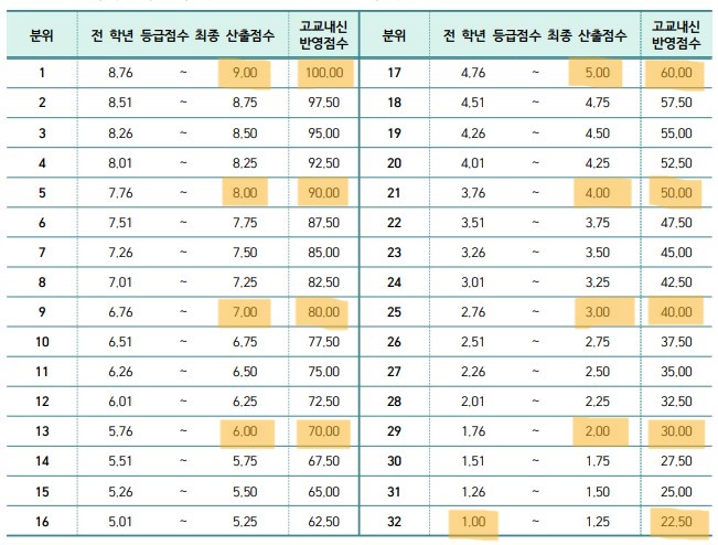 그리고 등급에 따른 반영점수를 과별 반영 비율에 따라 × 0.2, ×0.4, ×0.5 하면 내신의 실제 점수.