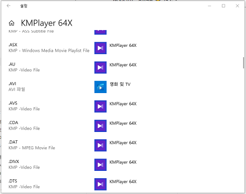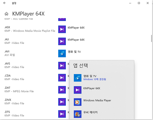 예를 들어, 동영상 파일의 경우 기본 앱이 어떻게 설정되어 있는지 알아보기 위해 KM플레이어를 실행해 봤더니 AVI 파일의 경우 KM플레이어가 아닌 윈도우의 기본 앱인 영화 및 TV 앱으로 지정되어 있는 걸 볼 수 있다.