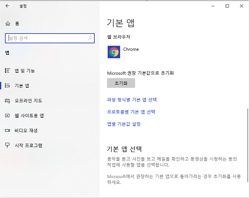 파일 형식별이나 프로토콜별 기본 앱 선택은 좀 어려울 수도 있으니 앱별 기본값 설정을 클릭한다.