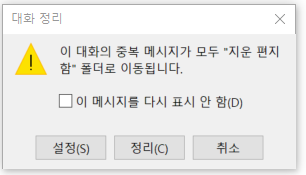 대화 정리는 이메일 답장을 서로 주고받다 보면 같은 내용이 계속 반복되어 답장에 추가되는데 이러한 중복된 기능을 제거할 수 있다. 아웃룩에서는 중복되는 이메일을 하나만 남기고 삭제해주는 기능이 있다. 중복되는 이메일을 삭제하려면 특정 이메일을 선택한 후 홈 -> 삭제 -> 정리에 들어가 대화 정리, 폴더 정리, 폴더와 하위 폴더 정리 등 세 가지를 할 수 있다. 대화정리는 이메일이 삭제되는 것이 아니고 내용을 보기 좋게 만들어준다. 폴더 정리는 현재 폴더 전체에서 모든 중복 이메일을 삭제해주는 기능이고, 폴더와 하위 폴더 정리는 현재 폴더의 이메일과 그 하위 폴더의 이메일까지 모두 삭제해주는 기능이다. 사서함 정리는 어떤 이메일 용량이 얼마만큼 차지하고 있는지 보여준다. 사서함 크기를 관리할 수 있고 지정한 날짜보다 오래되거나 지정한 용량보다 큰 이메일을 찾아서 삭제할 수 있다.