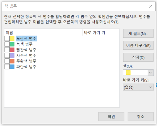 범주는 이메일 태그를 붙여서 나중에 분류하기 쉽게 하기 위한 기능이다. 폴더를 만드는 것이 아니라 부여한 태그가 이메일에 붙어서 보기 쉽게 하기 위함이다. 예를 들어, 모 프로젝트를 위해 여러 사람과 이메일을 주고받았다면 그 이메일들에 범주를 부여하면 나중에 빠르게 찾아볼 수 있다. 보류, 만료, 완료 등 각 이메일의 상태를 신속하게 판단할 수 있고, 카테고리별로 분류도 가능하다. 범주는 홈 탭에서도 찾아갈 수 있지만 마우스 오른쪽 클릭을 통해 범주를 선택해서 만들 수 있다. 기존 범주의 이름을 바꿀 수 있고 새로운 범주를 새 필드 생성으로 만들 수도 있다. 범주에 단축키도 지정할 수 있다. 또한 범주는 검색기능과 같이 쓸 수 있어 범주 순으로 정렬해서 볼 수 있다. 새로 만들기 버튼을 클릭하고 이름을 입력한다. 컬러 입력란 옆의 아래쪽 화살표를 클릭하고 카테고리의 색상을 선택해 관리하면 편하다. 선택할 수 있는 색상은 25가지 중에서 고르면 된다.