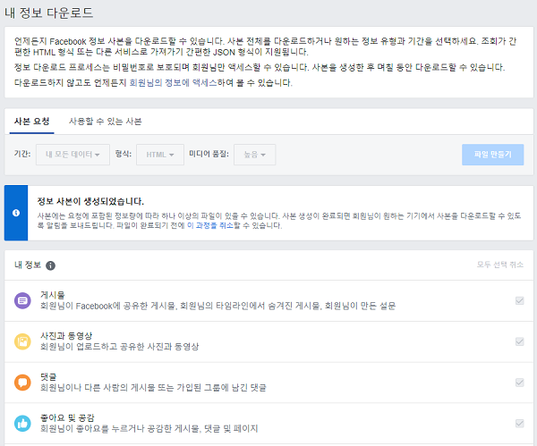 그 다음 기간과 형식, 미디어 품질을 선택하고 ‘파일 만들기’를 클릭한다. 바로 다운로드할 수는 없고 다운로드 파일을 만드는 데 시간이 소요된다. 다운로드 파일에는 게시물은 물론 사진과 동영상, 댓글, 좋아요 및 공감, 팔로잉 및 팔로워, 메시지, 프로필 정보, 결제 내역 등이 포함된다.