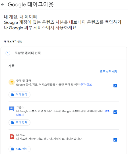 우선 구글 계정에 로그인한 다음에 takeout.google.com 사이트에 방문해야 한다. 모두 선택을 해제한 다음 원하는 부분만 다운로드할 수 있다. 지메일이나 연락처, 구글포토, 유튜브 등을 선택해서 다운로드할 수 있다. 빈도 옵션에는 한번 내보내기 혹은 1년 동안 2개월마다 내보내기 등 두 가지 옵션을 선택할 수 있다. 이메일로 내보내기를 할 수도 있고, 구글 드라이브, 드롭박스, 원드라이브, 혹은 BOX에 추가할 수도 있다. 크기가 큰 파일은 최대 50GB까지 파일 크기를 선택할 수 있다.
