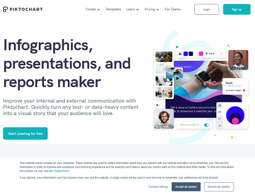 픽토차트는 외국 제작툴로 인포그래픽, 프레젠테이션 등 콘텐츠 제작을 지원하는 웹사이트이다. 웹사이트가 영문으로 되어 있어 다른 언어를 지원하지 않기 때문에 크롬 브라우저의 번역 기능을 사용하는 것이 좋다. 무료 사용자의 경우 제한이 따르지만 개인적인 용도로 사용하는 데는 큰 지장은 없다. 픽토차트는 회원가입을 해야 사용할 수 있는데 이메일과 비밀번호만으로도 가입이 가능하고 구글이나 페이스북 계정 연동으로 가입할 수도 있다. 가입한 후에는 인포그래픽, 프레젠테이션, 인쇄물 3가지 콘텐츠로 제작이 가능하다.