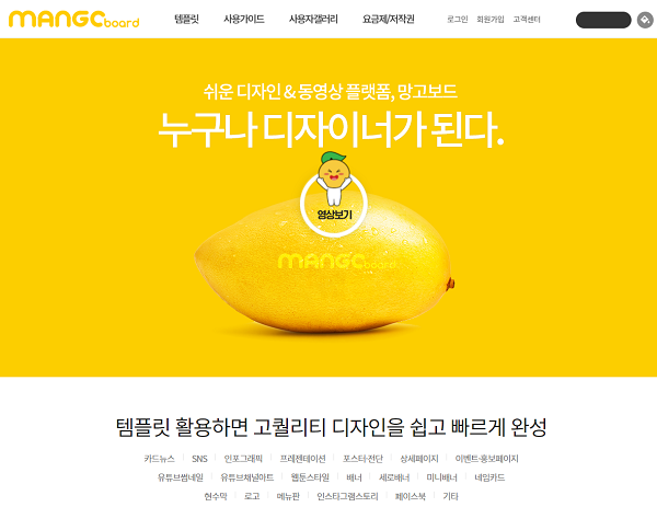‘누구나 디자이너가 된다’는 슬로건을 내건 망고보드는 카드뉴스 만들기와 동영상 제작을 동시에 할 수 있는 것이 가장 큰 특징이다. 저작권 없이 무료로 사용할 수 있지만 워터마크가 포함되어 있어 유료회원으로 가입해야 워터마크 없이 사용 가능하다. 네이버, 카카오, 구글 등 SNS 계정으로 간편 로그인할 수 있다. 템플릿은 카드뉴스, SNS, 인포그래픽, 유튜브 썸네일 등과 같은 22가지의 용도와 쇼핑몰, 공공센터, 교육기관, 기업 등과 같은 12개의 사용처로 구분되어 이미지 포맷 뿐만 아니라 동영상 템플릿도 준비되어 있다.