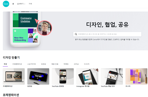 캔바는 편리하게 수정할 수 있게 템플릿의 원소스를 제공하고 편지도 용이한 제작툴이다. 메뉴가 어떤 목적으로 작성할 것인지에 따라 구분되어 있다. 인스타 게시물, 보고서, 포스터, 전단지 등을 선택한 후 카드뉴스를 만들면 된다. 먼저 주제별 카드뉴스를 선택하고 사진, 글자, 음악, 배경 등을 첨부할 수 있다. 무료 템플릿을 25만개 제공하고 있어 충분히 사용 가능하지만 퀄리티 있는 카드뉴스를 원하면 유료로 가입해 진행할 수 있다.