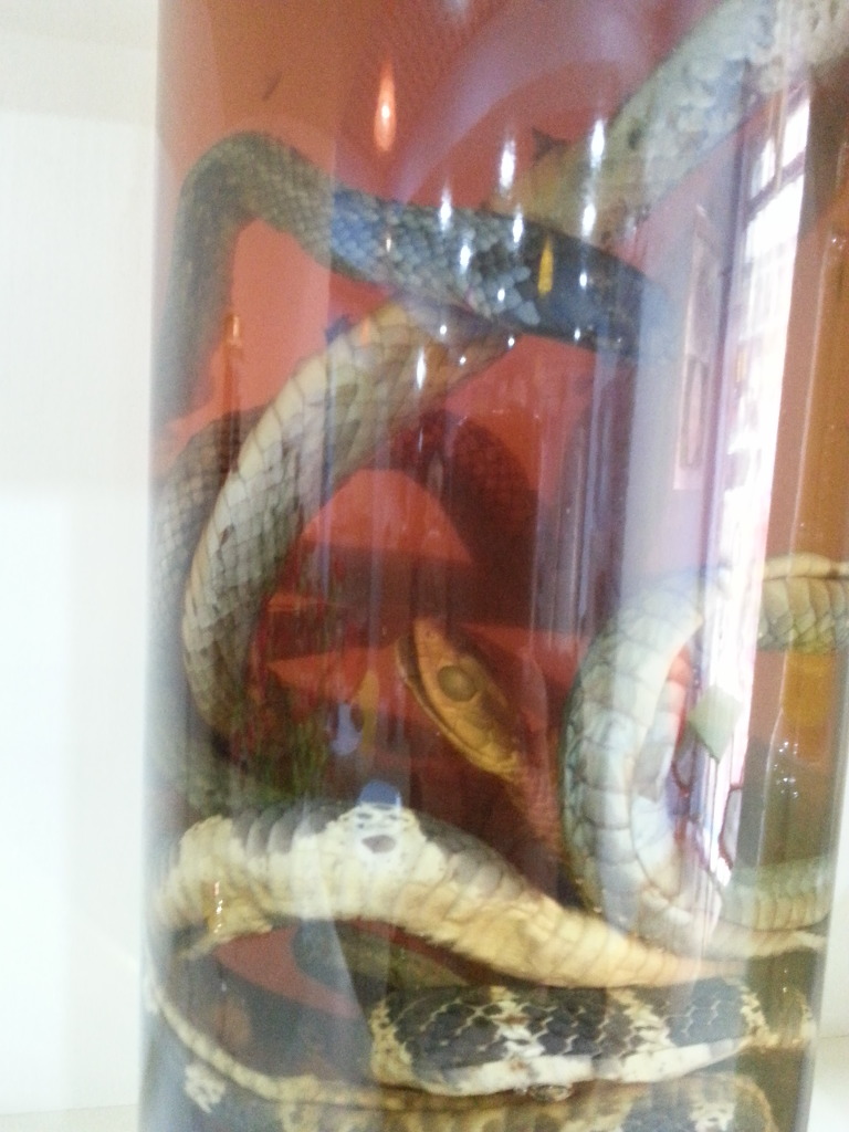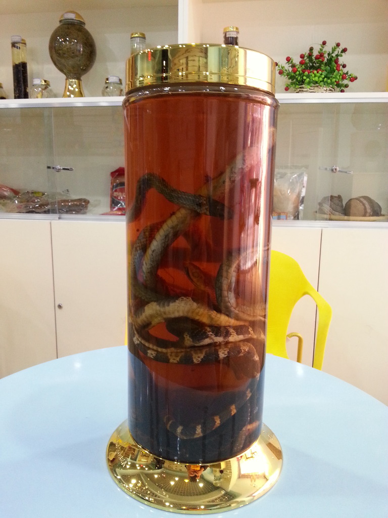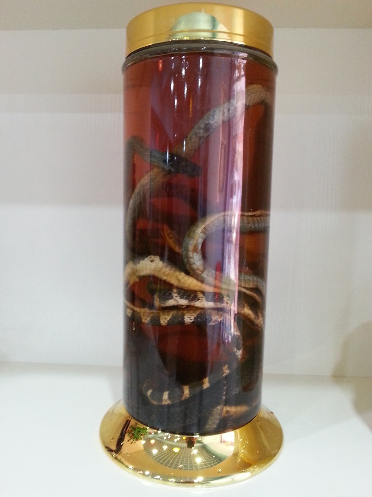 셋째, 도수 높은 고량주(高梁酒)나 양주(洋주)에 뱀을 넣어 1년 정도 냉암처(冷暗處)에 저장하여 두었다가 마신다. 이처럼 뱀술은 사람에 따라 각자의 식성에 따라 자유자재로 만들어 먹을 수 있다.