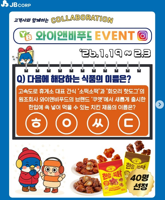 [JB주식회사] 와이앤비푸드 이벤트 ~ 2월 3일 작성자이벤트|작성시간26.01.24|조회수19 목록 댓글 0 글자크기 작게가 글자크기 크게가 응모기간2026년 2월 3일 까지경품한입쏙닭 데리야끼맛 + 핫양념치킨맛 총 4팩 총 40명바로가기https://www.instagram.com/p/DTq4v3bk0Ym스크린샷 다음검색 현재 게시글 추가 기능 열기 북마크 공유하기 신고 센터로 신고 댓글 댓글 0 댓글쓰기 답글쓰기 댓글 리스트