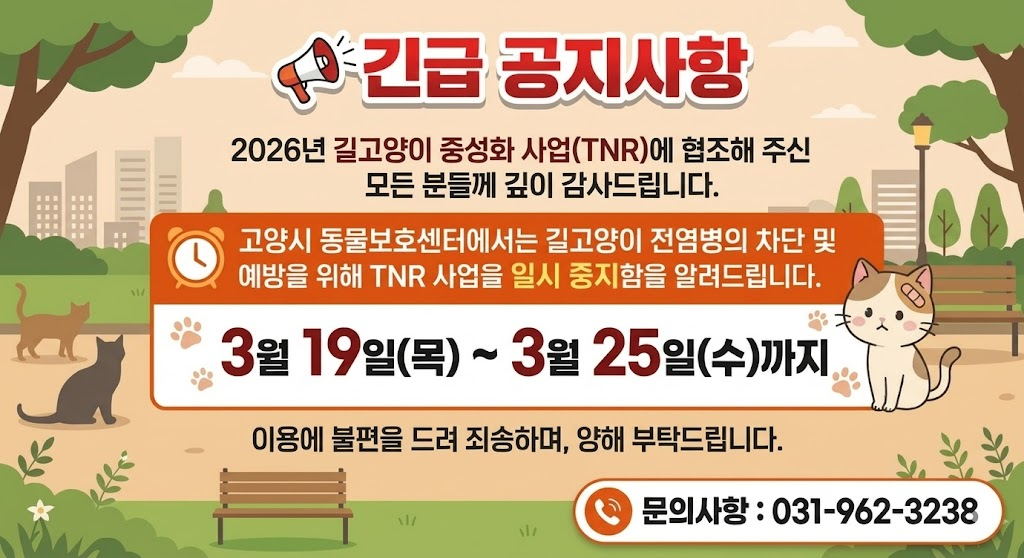 범백 잠복기를 고려하여 고양시 동물보호센터 내 길고양이 중성화 수술은 3월 25일까지 중단 후 3월 26일(목)에 재개할 계획이오니 이점 양해하여 주시기 바랍니다.