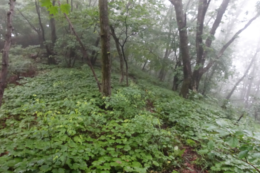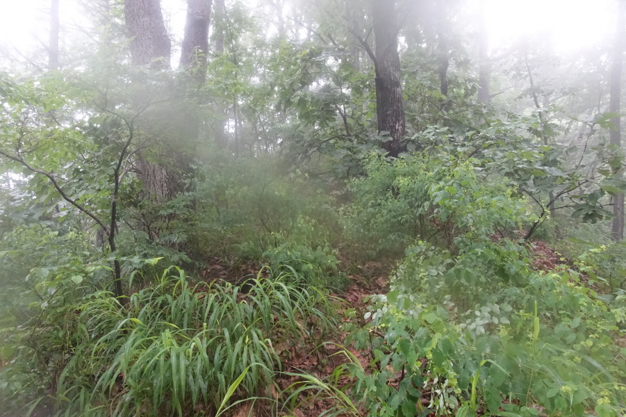 사람이 왕래가 있었던지 한강기맥길에 비교 약간 거칠지만 진행할만 하다. 우중 힘든 오름길이 진행속도를 더디게 한다. 내려선후 다시 힘들게 올라 (13;20)노천산(664m)정상에 선다.[2.2km][48분]