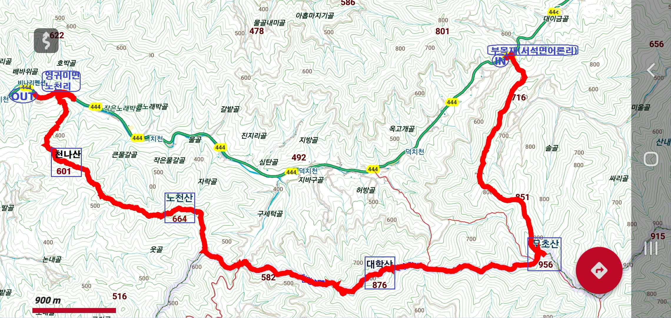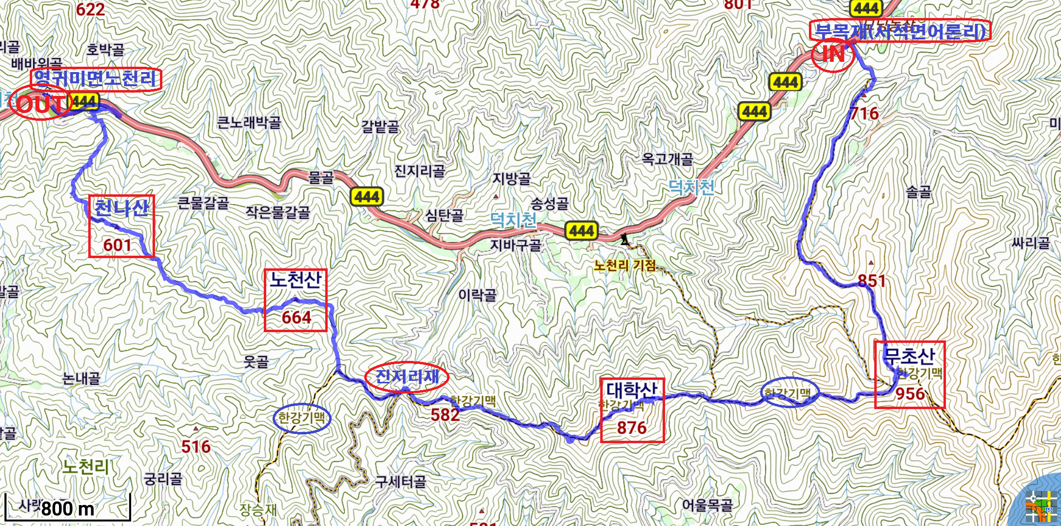 산행코스;부목재(서석면 어론리) - 715.9 - 무초산(956.2) - 대학산(876.4) - 582.4 - 진지리고개- 노천산(△664.3) - 천나산(601.1) - 444번도로(영귀미면 노천리 285번지 근처공터)