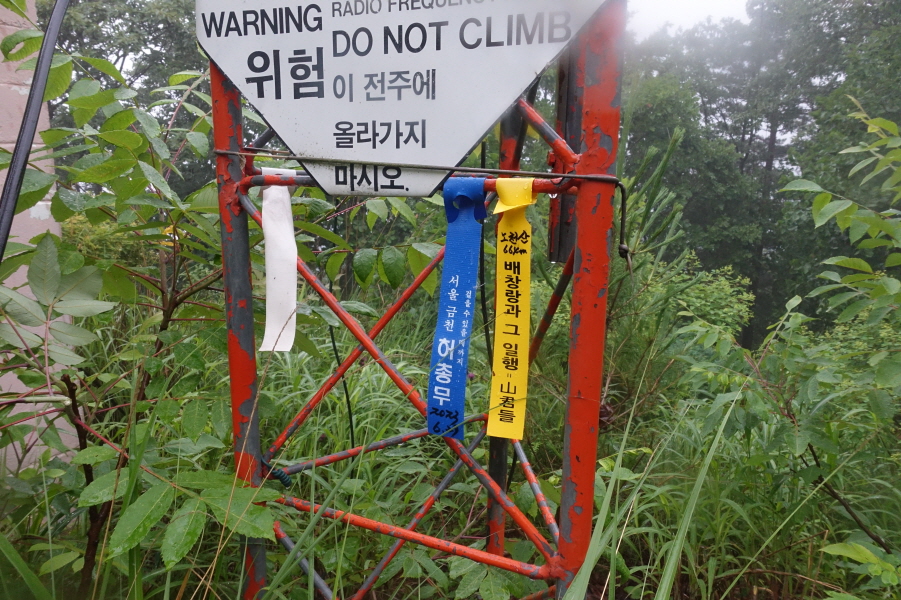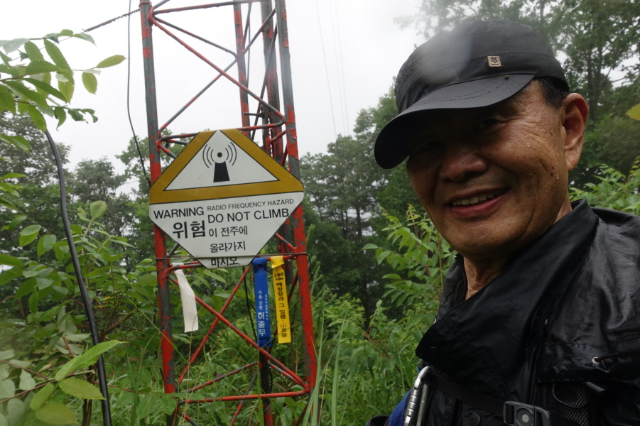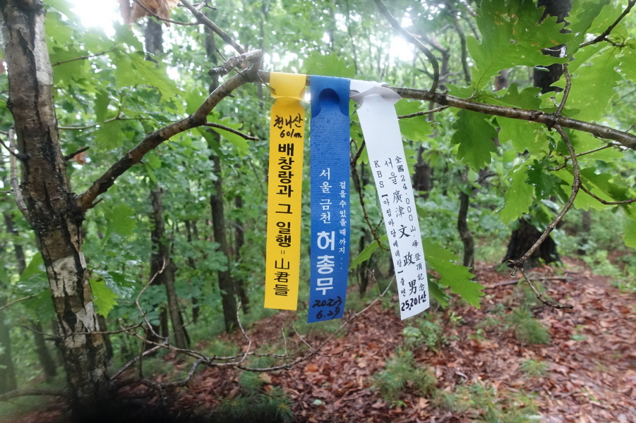 송신탑과 송신탑가동시설 건물이 설치되어있다. 삼각점(청일302) 도 있다. 송신탑기둥에 표지기걸고 인증사진 남긴다. 식당이동 예정 시간(14;00)까지 맞추기가 쉽지 않아보여 마음이 급해지면서도 뒤에 있는 후미팀 믿고 천천히 안전 산행을 신경쓴다. 후반부 산길이 이외로 잔펀치가 많은 능선길이다. 우중 장님산행 힘들다. 오르내림이 만만치 않다. (14;01)천나산(601m)정상에선다.[1.5km][40분]