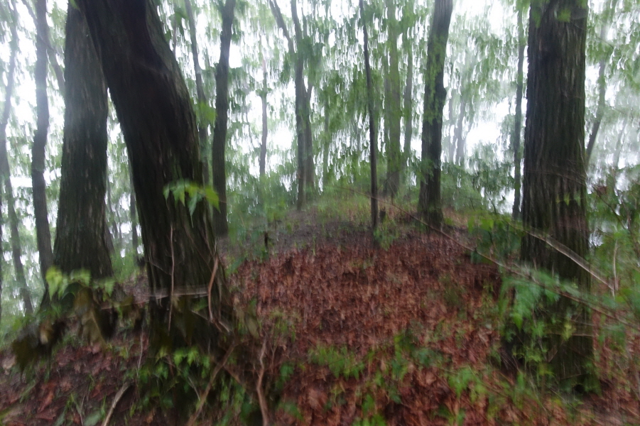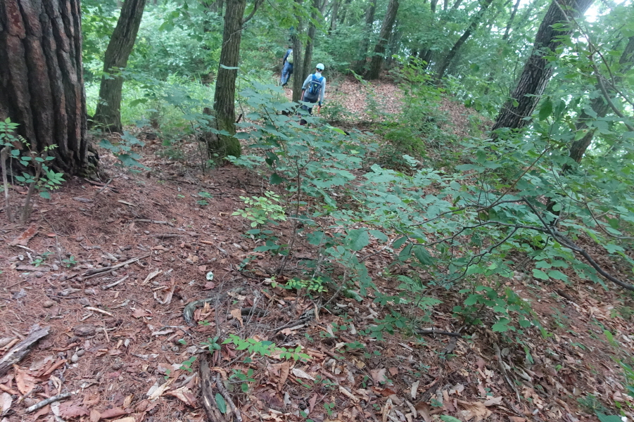 공터봉 정상에는 삼각점(청일410/2005재설)이 있다. 선답자가 걸어둔 힌 스텐레스 부식 정상표지판이 나무에 걸려있다. 정상에서 하산길은 서쪽 능선을 타고 내려간다. 한강기맥길이라 변곡점 마다 선답자의 표지기가 길을 인도한다. 묵은 헬기장을 지나고 444번 국도로 내려서려면 오른쪽 능선길로 내려서야 한다. 내려오다 보면 또 한번의 갈림길에서 오른쪽 능선길로 접어든다. 칼날 같은 능선길을 따라 내려오다 보면 곧게 자란 적송과 굵은 참나무숲을 지난다. 마사토 빗길 내리막길이 엄청 미끄럽다. 580m봉을 오르는 것을 끝으로 곧바로 진지리 고개로 내려선다. [2.0km][51분]
