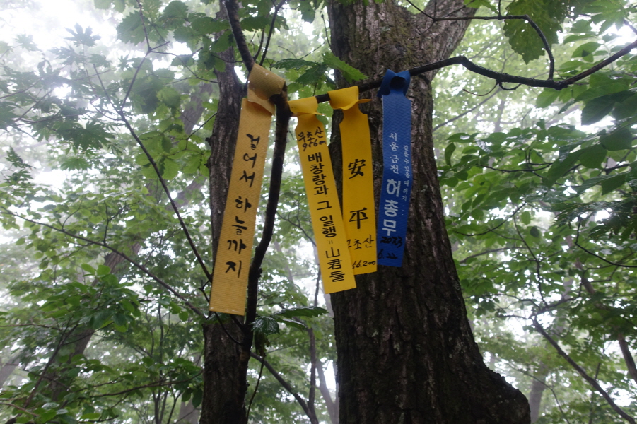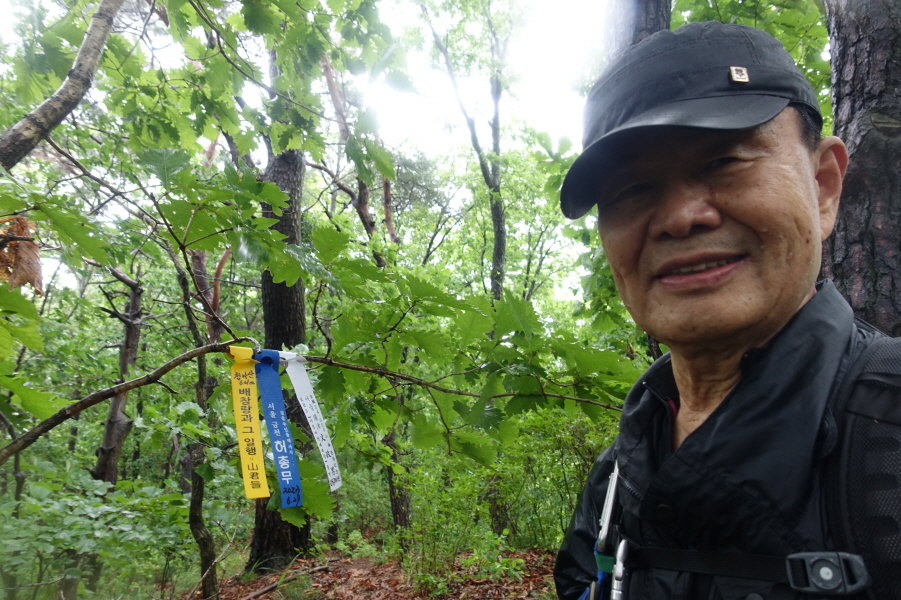 (13;20~13;21)[1분]노천산(664m)정상에 표지기겁니다. 준족 김경찬님표지가 안보여 이상타 생각했는데 선두그룹 4인이 알바후 진지리재에서 탈출했다는 군요~ㅎ.