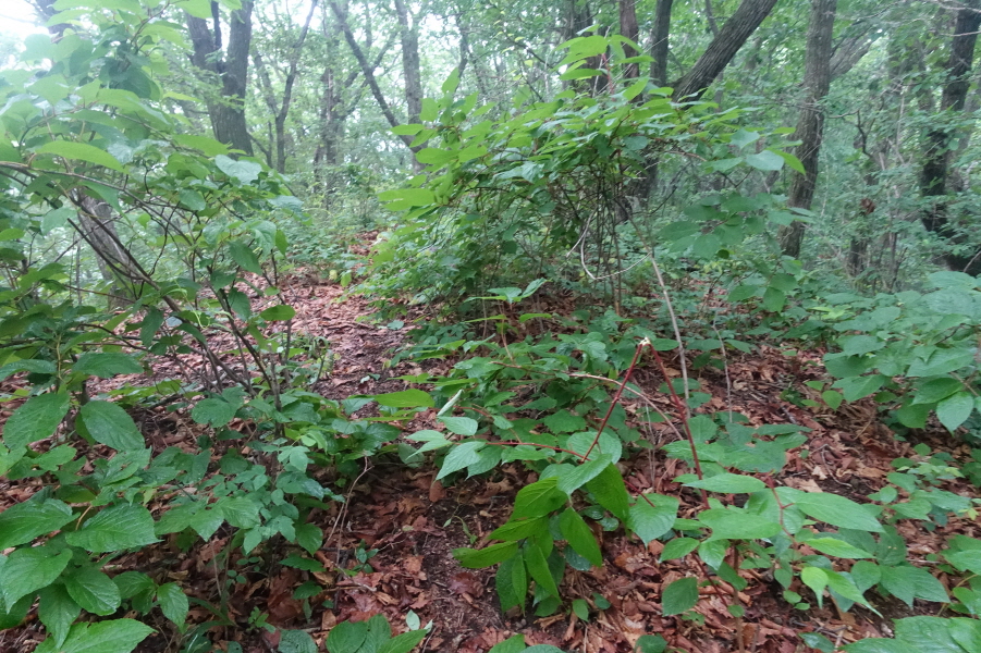 왔던 길을 악20m Back (09;42)고개마루 우측 차단기를 지나 임도 따라 오른다. 임도가 좌측으로 곡각되는 지점에서 양쪽 능선 사이 사면길을 치고 오른다. 묵은 길이지만 잡초속에 길 흔적은 있다. 약10여분 치고 올라 (09;54) 능선하류점에서 우측능선을 따라 편안하게 진행한다. 꾸준한 오름 능선길이다. (10;28) 좌측으로 능선허리길 이어가 직진 오름길 올라 한강기맥에 들어서 한강기맥 따라 잠시(약20m 거리)무초산 정상을 왕복한다. (10;39)무초산(956m) 정상이다.[3.0km][58분]
