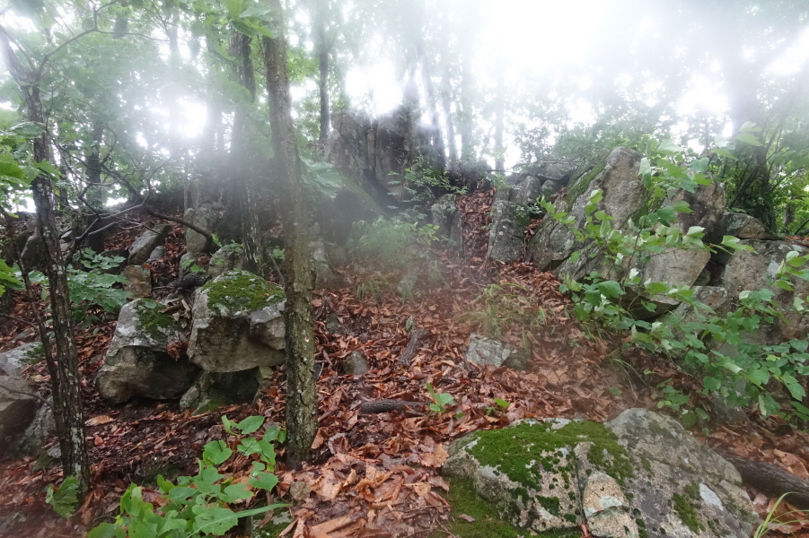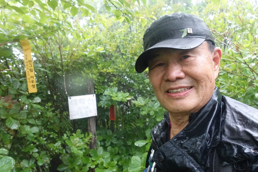 표지기걸고 인증사진 남긴다. 서둘러 한강기맥길 따라 내려서 좌향 내림길 내려선다. 굵은 빗방울로 바뀌어 우비 챙겨입고 베낭커버 씌운후 능선길 오르내린다. 급경사 내림길도 내려서고 임도따라 올라왔던 길도 만나 2번째 밟는 바위길을 조심스럽게 밟고 올라 정상을 다 올라가서 바위지대를 지나면 거대한 바위사이에 걸쳐져 있는 천연의 구름다리를 건넌다. 동굴( 발 밑으로 깊이가 2m, 길이가 10m쯤 되는 굴이 나있다)을 지나 세미클라이밍으로 능선에 붙어 노송지대 능선을 약30m 진행하여 (11;40) 대학산(876m)정상에 선다.[2.2km][61분]