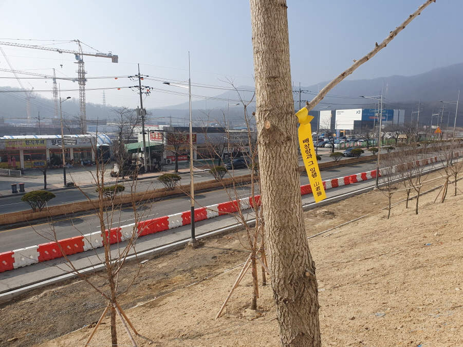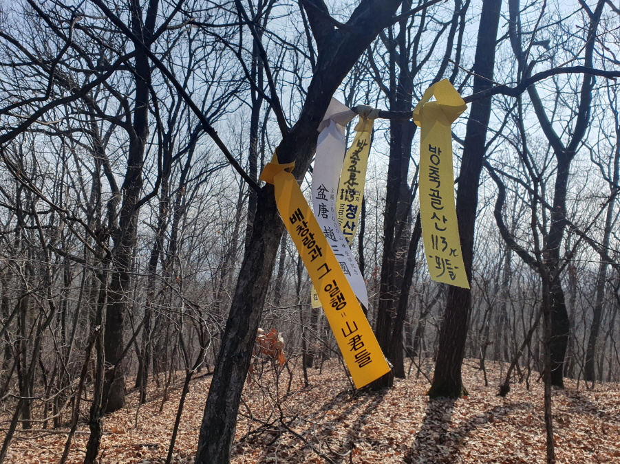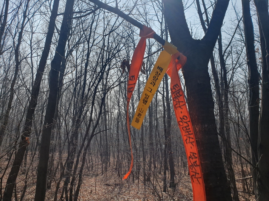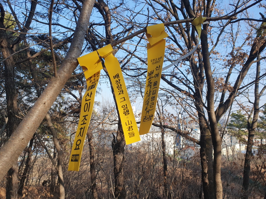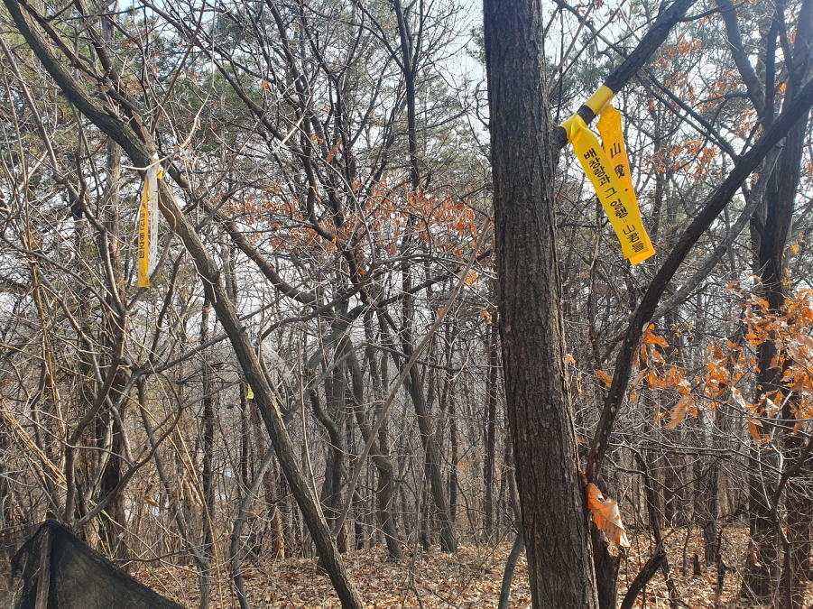 (11;06~11;09)[3분] 아파트단지 법면으로 형질변경된 뒷동산(80m) 자리 법면 조경수에 표지기겁니다