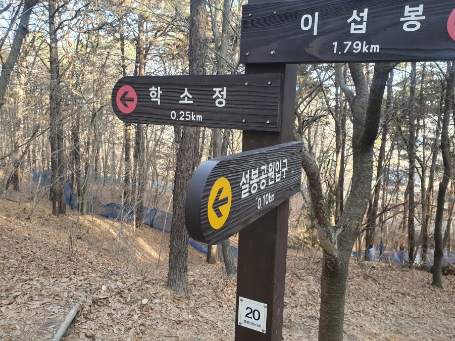 (15;51) 설봉고원 입구 갈림 이정표(학소정 0.25km/설봉공원입구 0.10km/이섭봉 1.79km)입니다