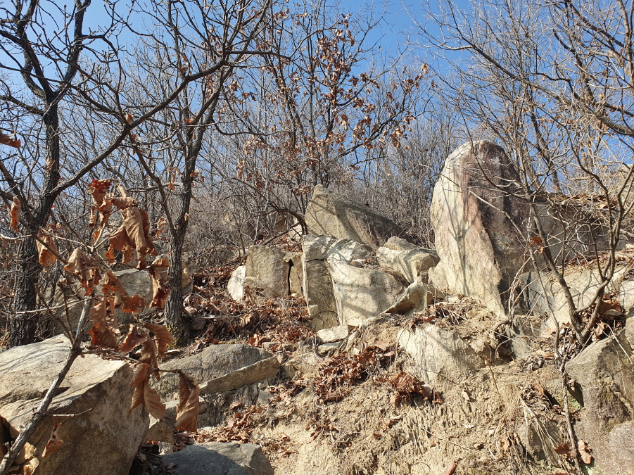 (14;43) 오름길 바위들입니다. 소왕배산에서 능선 타고 내려 42번 도로(중부대로)를 35번 도로(중부고속도로) 밑으로 "ㄷ자"로 건너 35번 도로(중부고속도로) 우측 동원 참치 물류센터진입길 따르다 능선에 붙어 산다운 산 능선길 진행하여 만난 오름길입니다