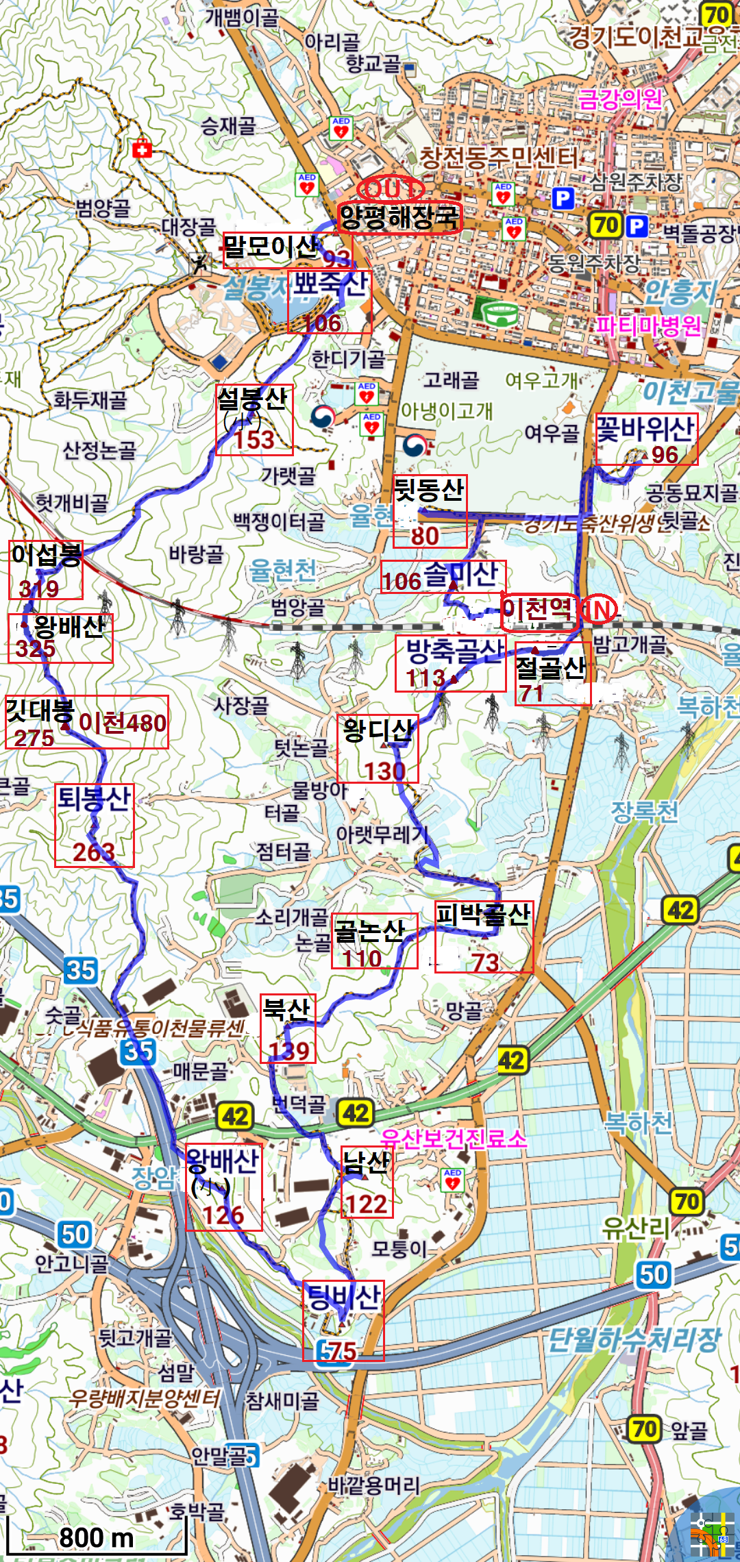 솔미산(106m) 뒷동산(80m) 꽃바위산(96m) 절골산(71m) 방축골산(113m) 왕디 산(130m) 피박골산(73m) 골논산(110m) 북산(139m) 남산(122m) 팅비산(75m)小왕배산(126m) 퇴봉산(263m) 깃대봉(275m△이천 480) 왕배산(325m) 이섭봉(319m) 小 설봉산(153m)뾰족산(106m)말모이산(93m)/경기이천 19 산