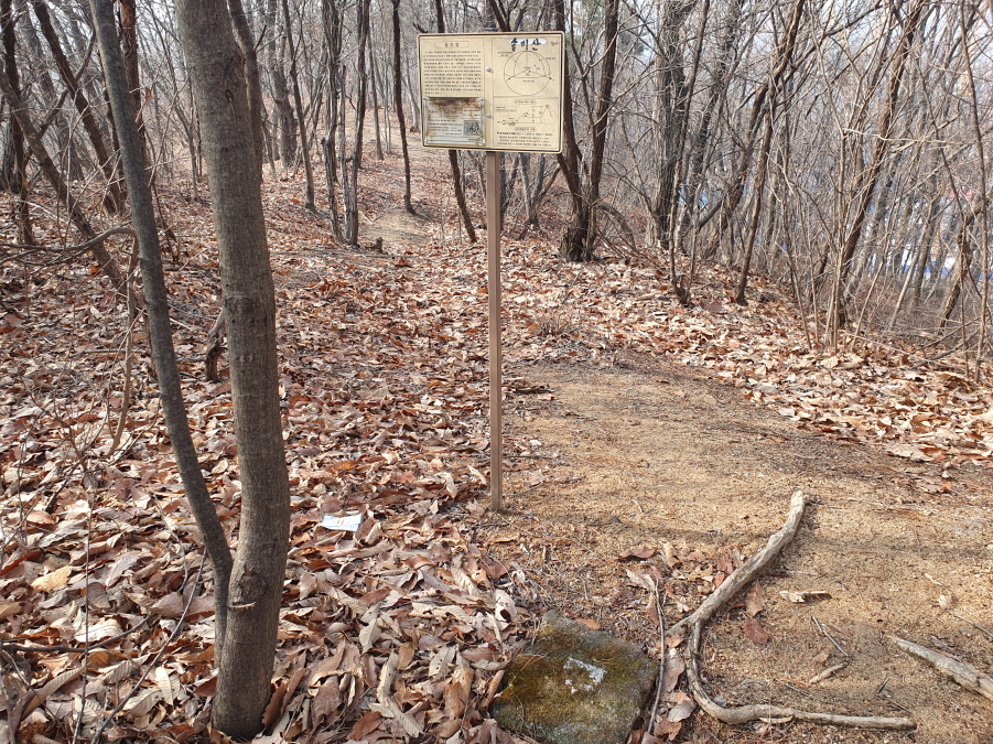 (10;50) 솔미산(106m) 정상 삼각점(이천 33?/판독어려움)과 설명판입니다.