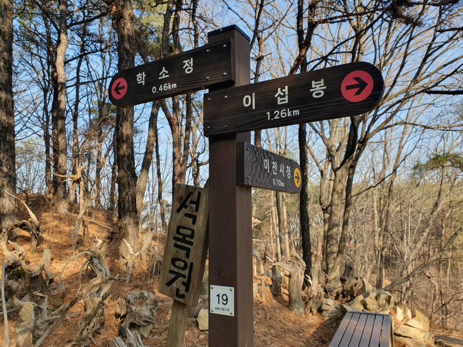 (15;43) 이천시청 갈림 이정표( 학소정 0.46km/이천시청 0.70km/이섭봉 1.26km)입니다. 그리고 석목원 표지판입니다