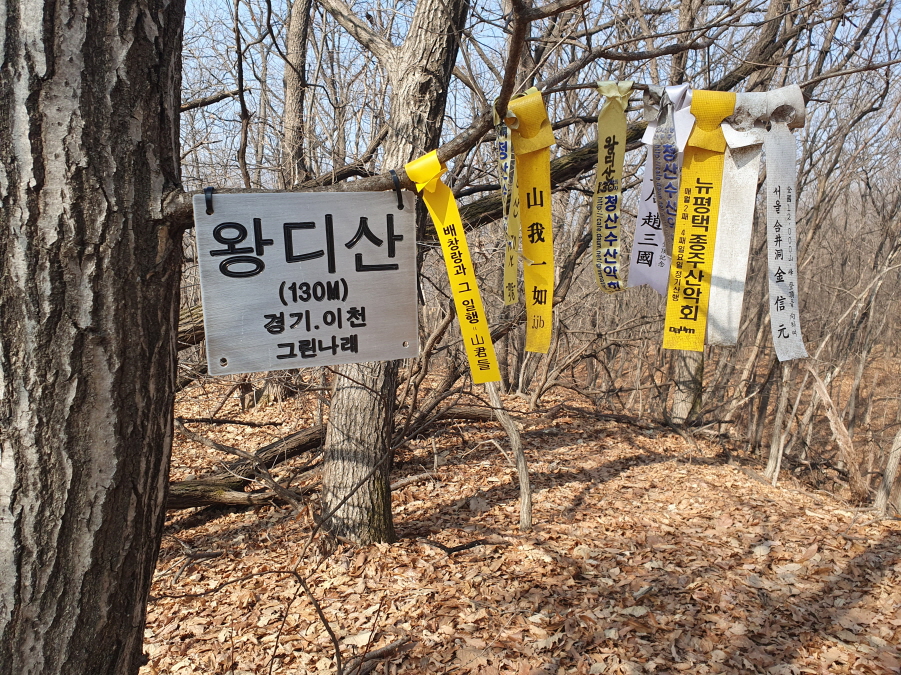 그린나래님 부착한 정상표지판 매여있고 선답자님들표지기 걸린 왕디 산(130m) 정상이다.