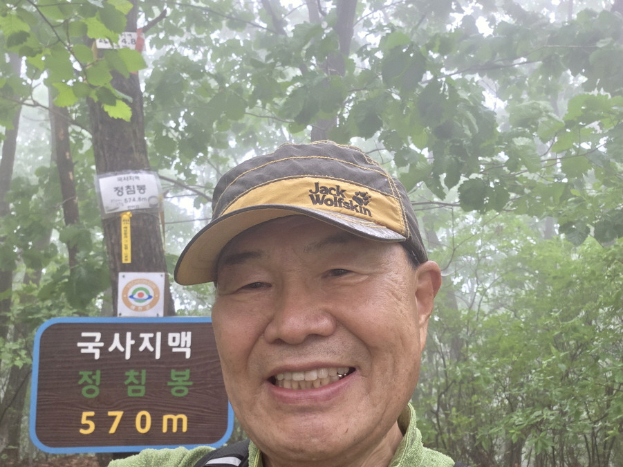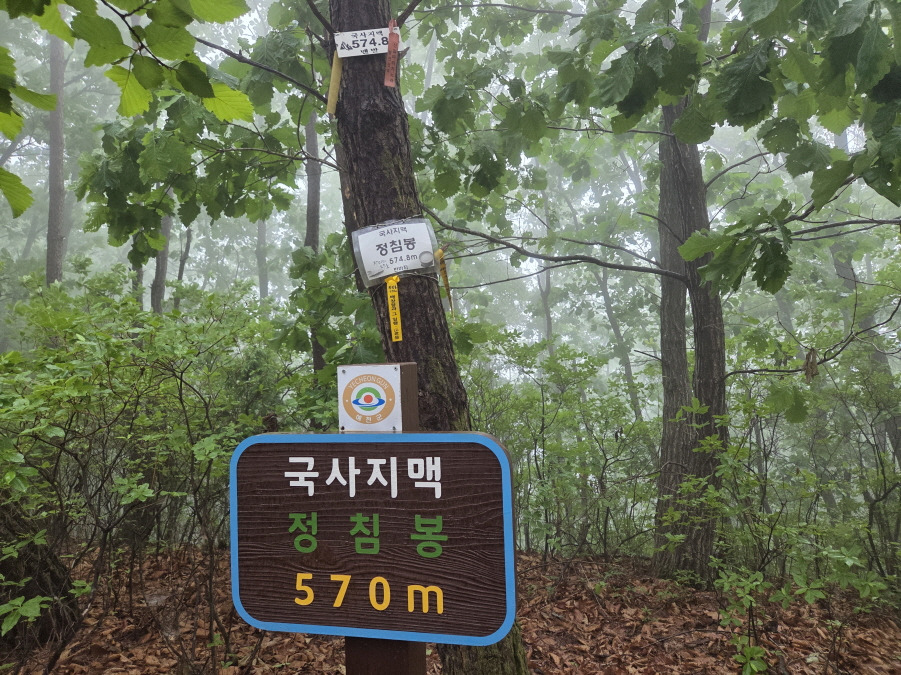 정상표지목판 (국사지맥 /정침봉 570m) 서있고 반바지님 비닐코팅 표지판(국사지맥/정침봉 574.5m)그리고 맨발님 표지판(국사지맥 574.8m) 걸려있는 정상이다.