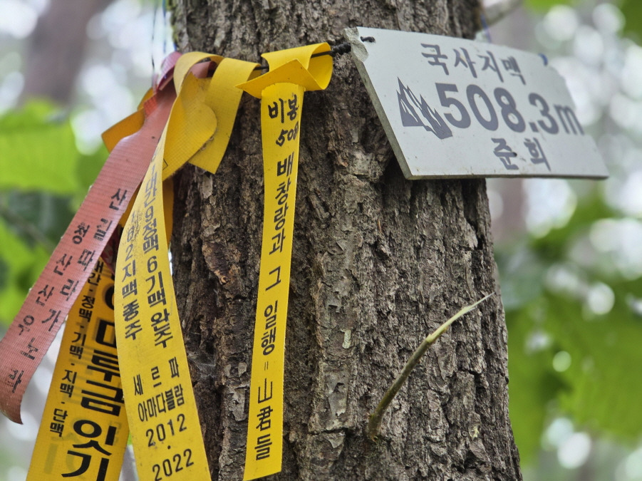 준희 님의 표지판 (국사지맥 508.3m) 걸려있고 많은 선답자님들의 표지기 걸린 정상이다. Back 한다.