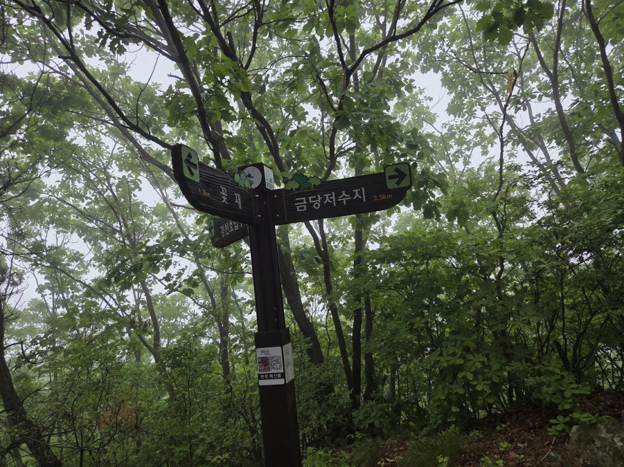 (14;09~14;11) 국사봉정상석봉(718m) 이정표(경천호입구 2.5km/금당저수지 3.5km/꽃재 1.3km)입니다. 국사지맥은 이정표(경천호 입구) 방향입니다. cf헬기장 금당저수지 방향은 알바길입니다.