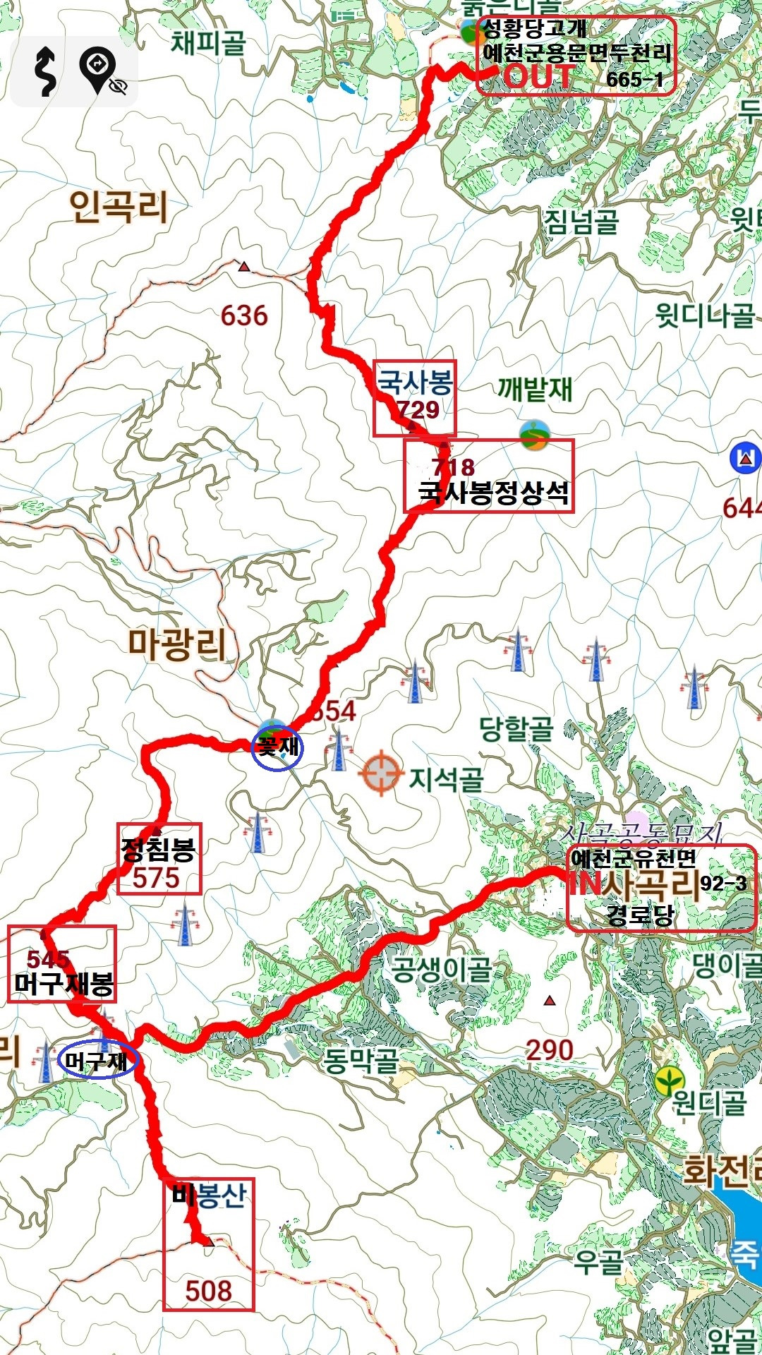 산행코스; 사곡리경로당 (경북 예천군 유천면 사곡리 92-3) →화전길 →머구재(가곡리/사곡리)→비봉산(508) 왕복 → 머구재 →머구봉 545 → 정침봉 575 → 꽃재 → 국사봉정상석 718 → 국사봉 729 → 성황당고개(경북 예천군 용문면 두천리 665-1)