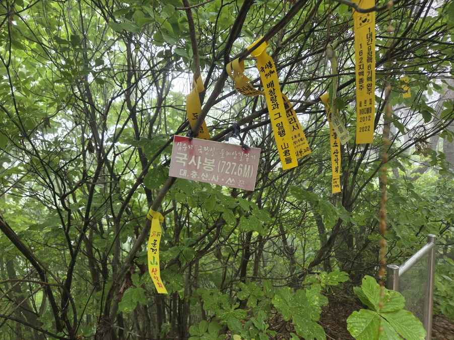 삼각점과 삼각점 설명판 있다. 대. 추. 산. 사 님의 정상표지판과 많은 선답자님들의 표지기 걸린 정상이다.